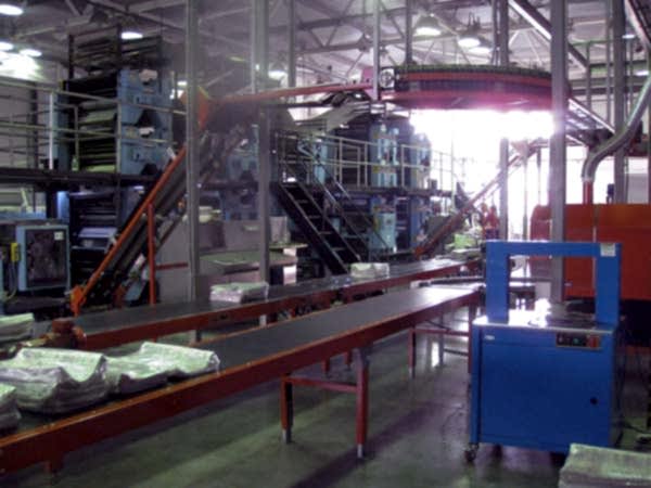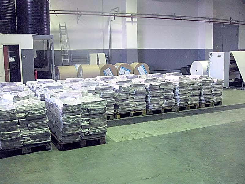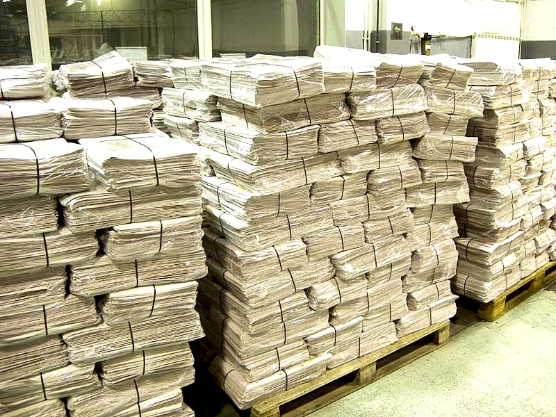 Сформированные пачки газет направляются по транспортерам к аппаратам, оборачивающим их полипропиленовой пленкой, и далее к термоусадочным тоннелям, где под воздействием высокой температуры пленка обволакивает пачки со всех сторон, плотно стягивая их. Готовая к отгрузке и транспортировке пачка имеет достаточную устойчивость и надежно защищена от «Пин-ап» погодных условий. Кроме того, при необходимости пачки могут обвязываться прочной полимерной лентой на обвязочной машине.